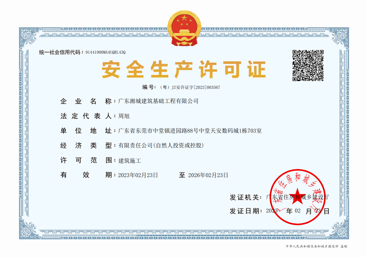 廣東湘城建筑基礎工程有限公司,成立于2016年,注冊資金4888萬元,持有地基基礎工程專業(yè)承包壹級資質(zhì),具有安全生產(chǎn)許可證??沙薪痈鞣N基礎類施工,包括各類樁基礎、基坑支護、邊坡支護、地基強夯處理等施工業(yè)務。公司為地基與基礎工程專業(yè)承包、工程施工、技術(shù)咨詢、技術(shù)開發(fā)、技術(shù)服務、信息咨詢實體型企業(yè)。